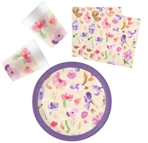 Watercolor Flowers, Virág party szett 36 db-os 23 cm-es tányérral
